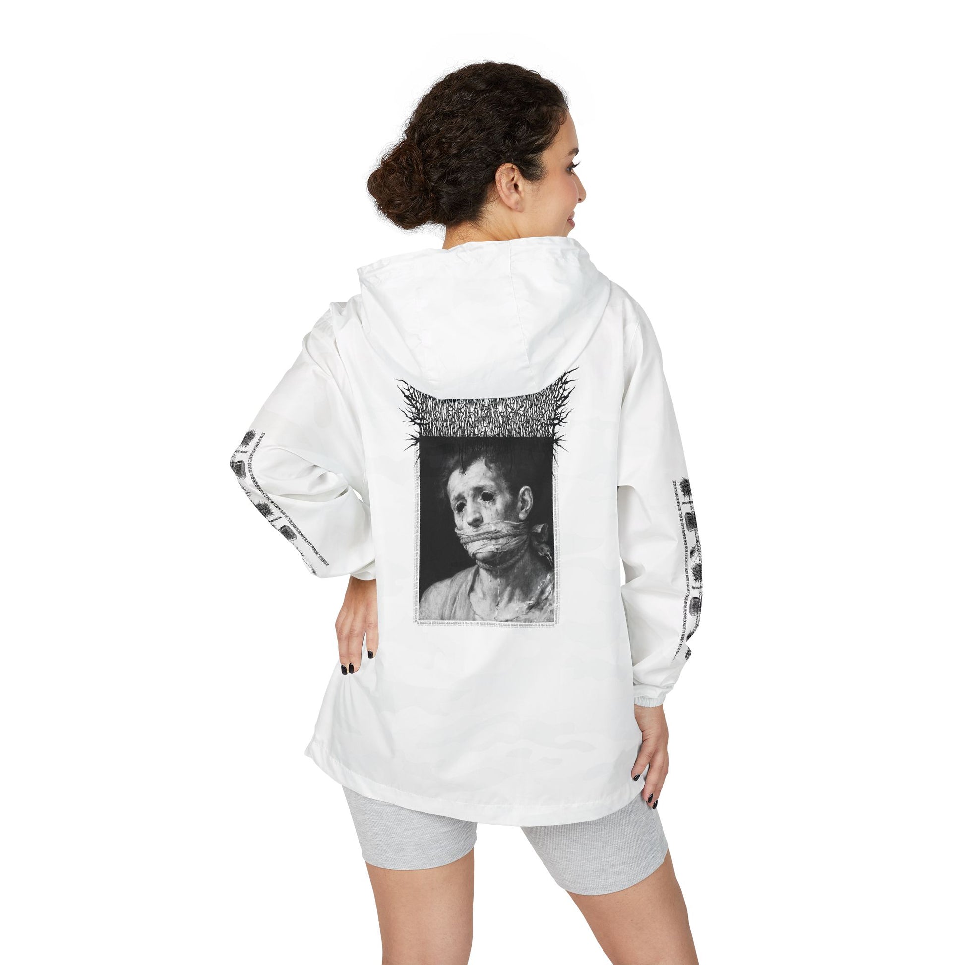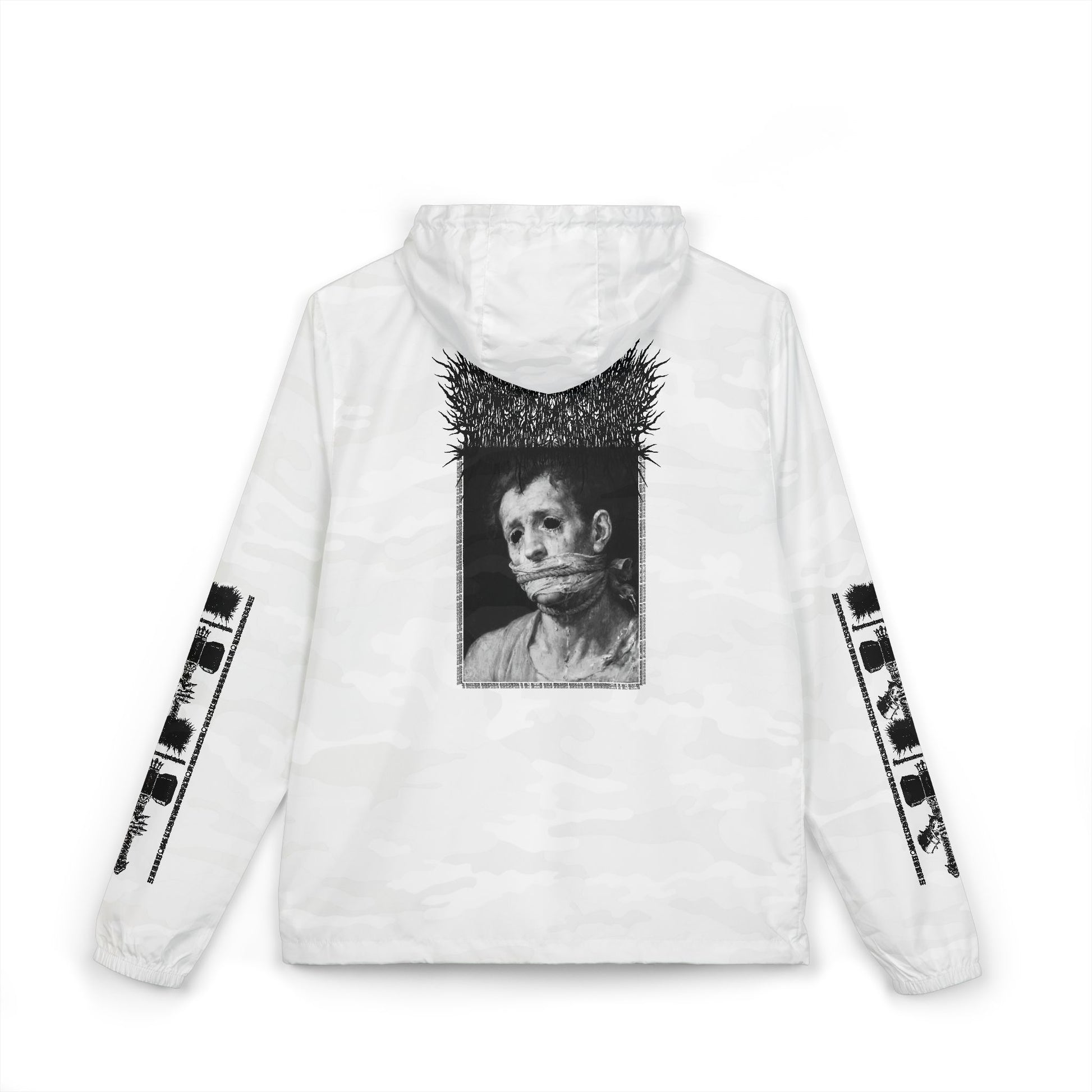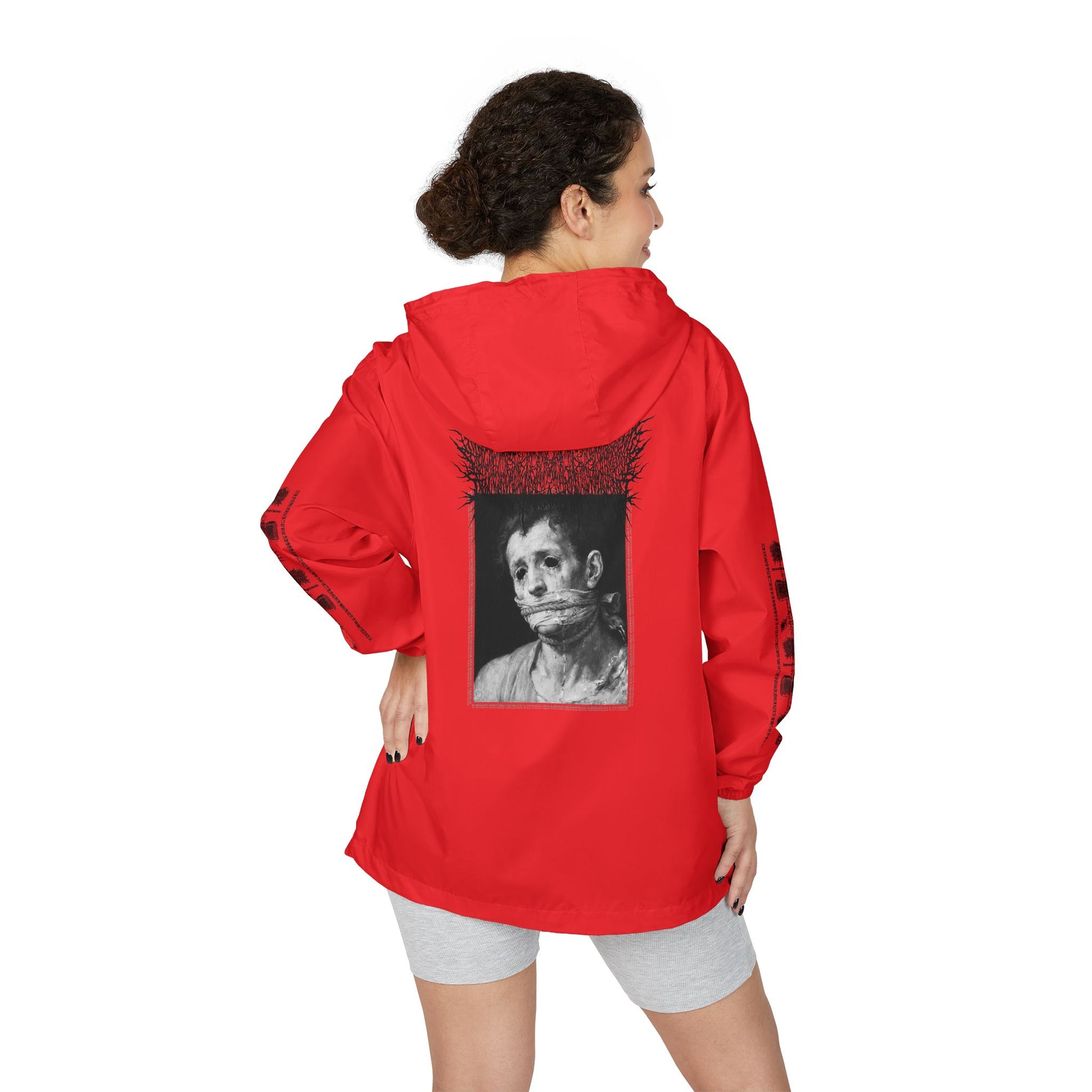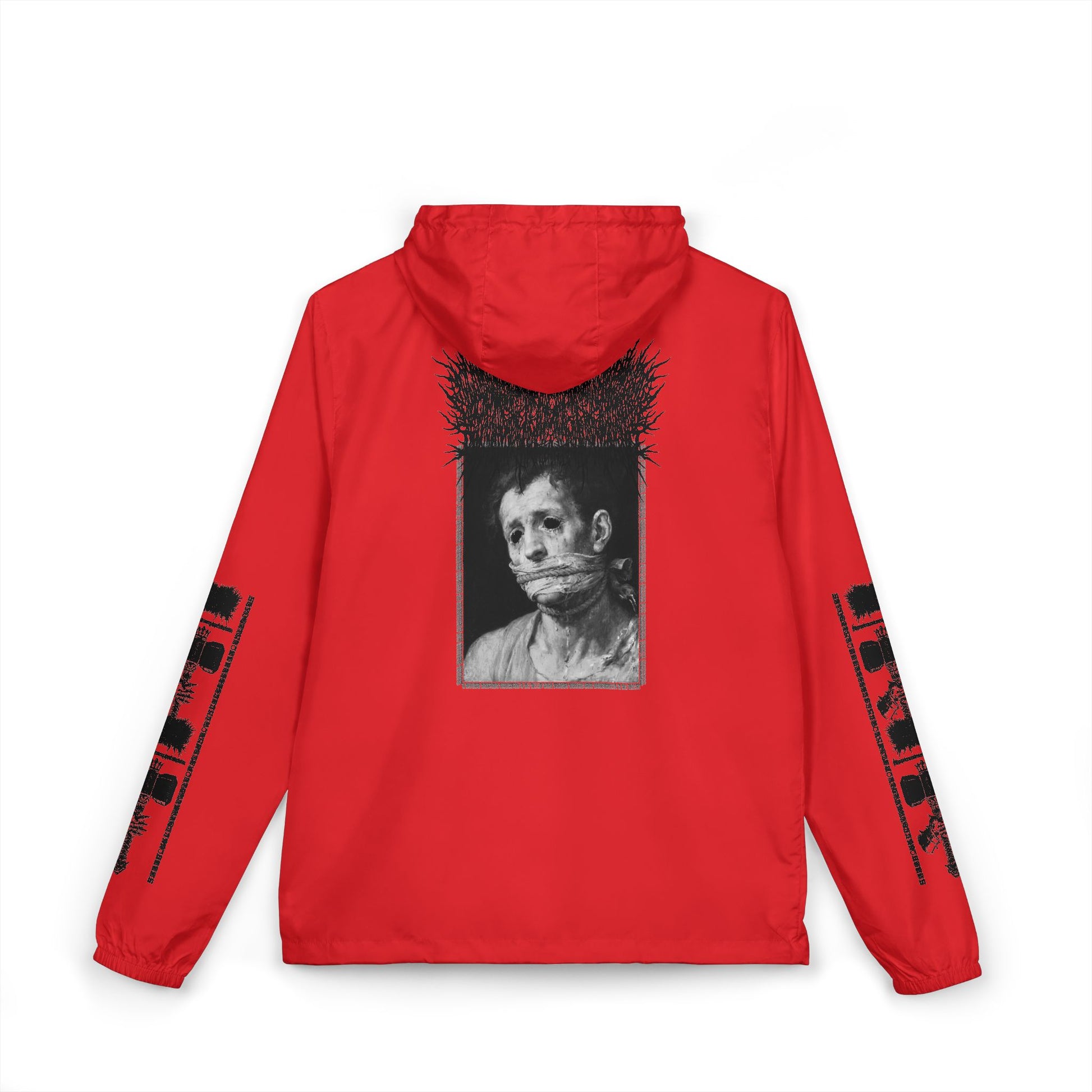 Extra-light 100% polyester shell (3.8 oz/yd²) sheds drizzle and dries fast without weighing you down. Mesh 3-panel hood and scuba collar block gusts while keeping things breathable. Full zip closure with two side-entry pockets for hands and essentials. Tear-away label keeps the interior clean. Graphic details across the back and sleeves give it that raw, underground edge, wearable art for people who appreciate striking, moody imagery.